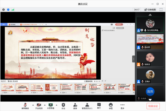 在腾讯会议开展了“在疫情大考中彰显中国特色社会主义制度优势”专题形势政策课。本次课程由石油工程学院党委书记张光明主讲,全院在读本科生、研究生党员参与学习。