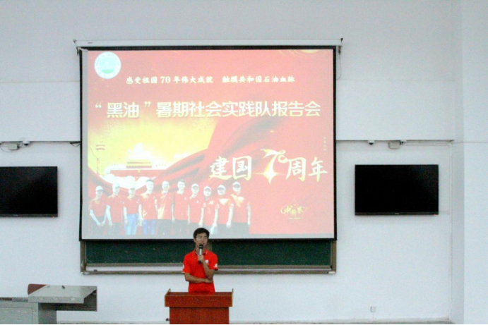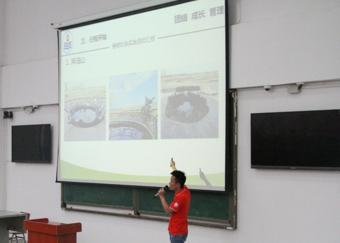 中秋节的假期给新生的军训增添了亮丽的一笔,上午的拉练也圆满结束。下午,新生同学们便来到了教学楼B座,倾听学长学姐们的分享。就坐完毕后,新生辅导员刘少文老师主持并宣布大会开始。刘老师讲到:“此次克拉玛依之行,我们见识了许多,获益匪浅,希望借助这次大会的机会让大家对石油行业有更深的一些了解。”社会实践小分队队长陈金建紧接刘老师的话音,接过话筒展开了他的演讲。陈金建从社会实践的前期招人讲起,再经过一系列的准备--收集信息、准备资料、规划路线、前期写稿······之后,实践活动正式展开。他讲到:此次克拉玛依之行并不容易,几十个小时的火车、一顿顿的泡面、辗转的夜晚,等等。过程虽然比较辛苦,但正是这样的辛苦才让我们的实践活动变得更加有意义。随后,他介绍了新疆之旅到达的地点和参观的流程以及对新疆的看法,让新生同学们对新疆及其石油产业有了初步的了解,台下同学也是被精彩的讲述深深吸引。