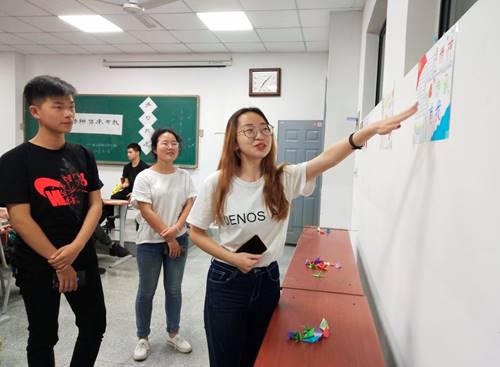 随后每个小组的同学都派出了一名代表,为同学们讲解自己作品的创作理念与创作历程。有的同学说道,在绘制团徽的时候,他才第一次近距离地仔细观察了团徽的构成要素;有的同学将磕头机、“一带一路”、俄文“世界你好”等元素巧妙地与五四精神结合在了一起……