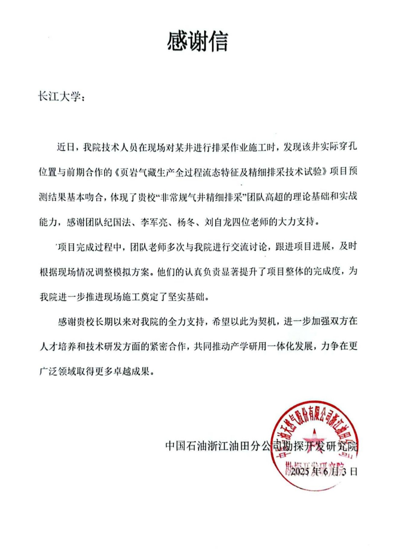 (通讯员 张璐洁)近日,中国石油浙江油田勘探开发研究院向我院发来感谢信,感谢我院“非常规气井精细排采”团队纪国法、李军亮、杨冬、刘自龙四位老师对浙江油田现场某井排采作业施工的大力支持。
