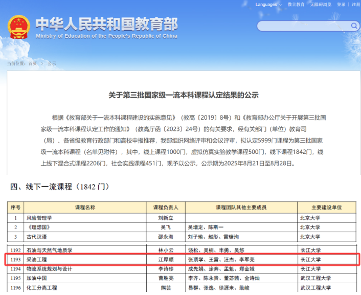 (通讯员 汪杰)近日,教育部公示了第三批国家级一流本科课程认定结果,我院取得新突破!由江厚顺教授担任课程负责人,张顶学、王雷、汪杰、李军亮老师为团队成员的《采油工程》喜获线下一流本科课程认定。这是我院首次获批国家级一流本科课程,标志着我院在本科教学课程建设方面取得历史性突破。