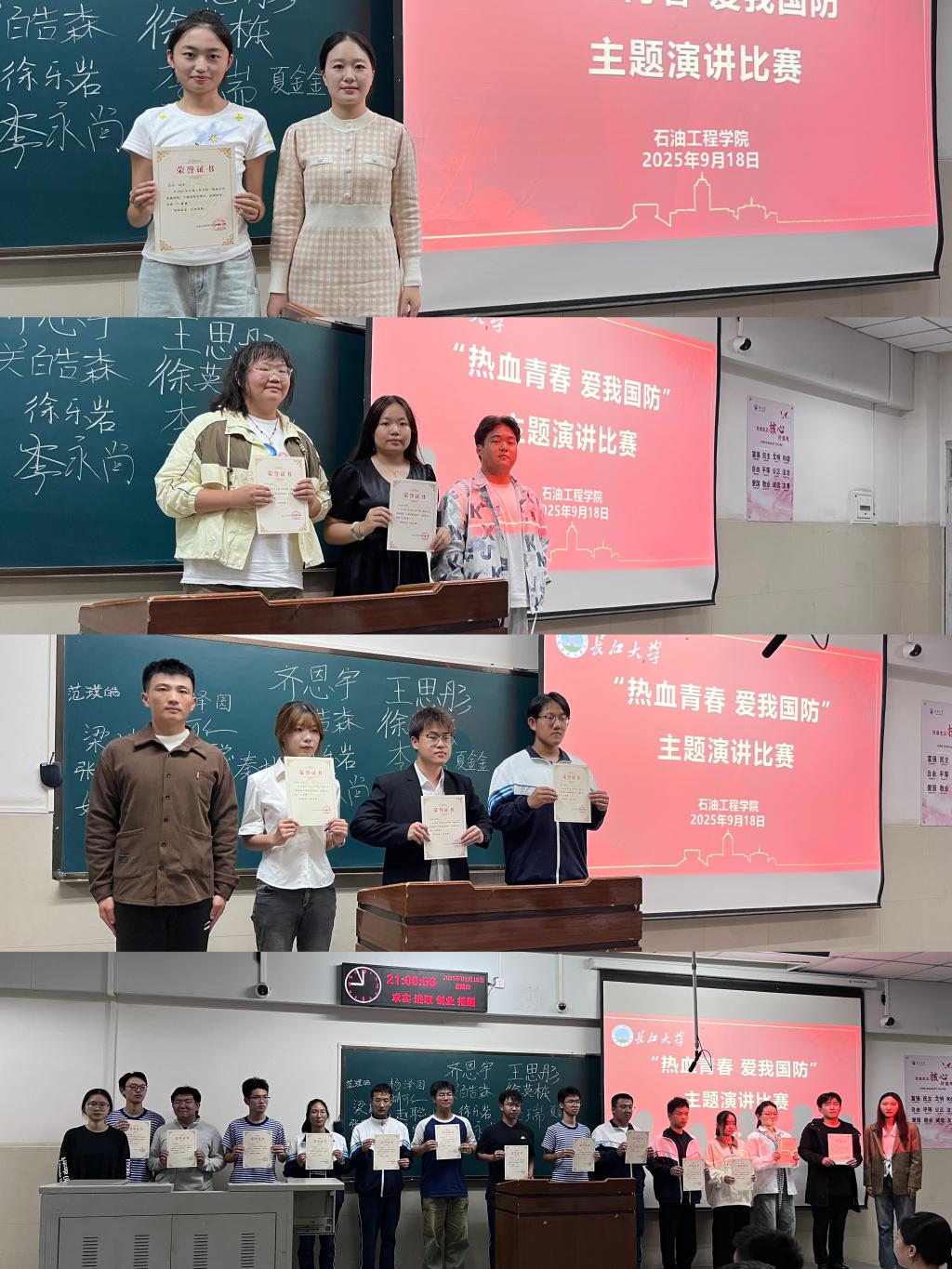 比赛中,选手们依次登台,围绕国防主题慷慨陈词。他们或回顾历史,缅怀英雄事迹;或立足当下,剖析国家安全形势;或展望未来,抒发报国之志。演讲内容主题鲜明、情感真挚,语言流畅、表达生动,充分体现了我院石油学子深厚的爱国情感,赢得了现场观众的阵阵掌声。