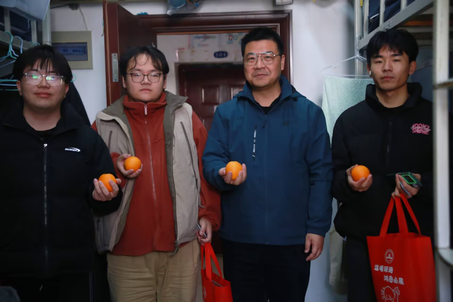 党委副书记张昊,毕业年级辅导员韩清越、张晓敏一同前往考研学子寝室,开展“考研送温暖“活动,为即将奔赴考场的同学们送上诚挚关怀和美好祝愿。