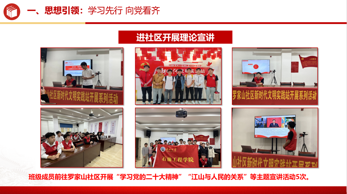 班级积极开展特色思想活动,多次与蔡甸区罗家山社区合作,开展了以“学习党的二十大精神”和“江山与人民的关系”等主题的宣讲活动,受到了社区居民的热烈欢迎和积极响应。在此过程中,班级不仅增强了社会责任感,更是荣获色情直播