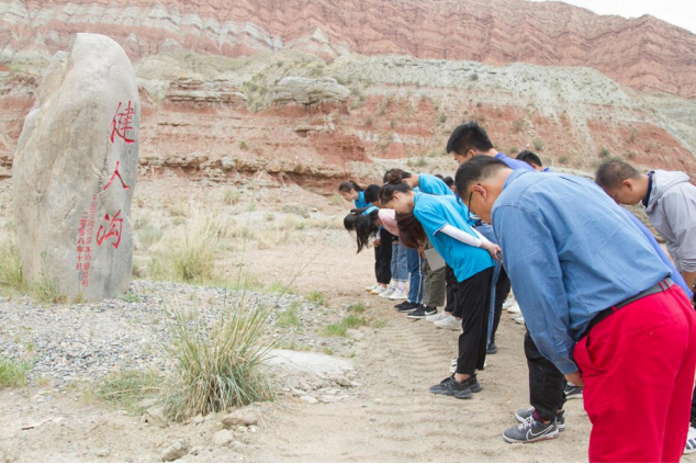 图为实践队员在“健人沟”前缅怀、纪念石油前辈。通讯员 陈金建 摄