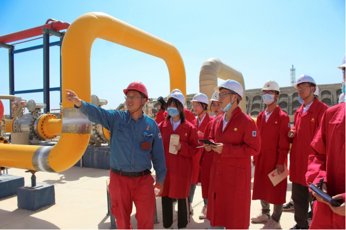 图为迪那作业区秦骁工程师向“黑油”实践队队员介绍气田生产情况。通讯员 陈金建 摄