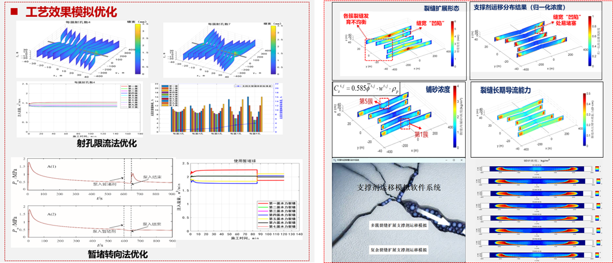 针对致密油气、页岩油气及碳酸盐岩油气等低渗透储层改造难题,团队创新发展了适用于深井与超深井的高效压裂与改造新工艺,形成了地质—工程耦合的系统优化框架。提出了水平井多簇压裂优化与暂堵均衡扩缝防窜技术、缝网压裂智能诊断与优化技术与复杂缝网高效铺砂与长效支撑技术,建立了基于机理约束与智能算法融合的裂缝扩展模式识别与施工优化模型,实现了从改造机理研究到现场智能优化的全链条创新。