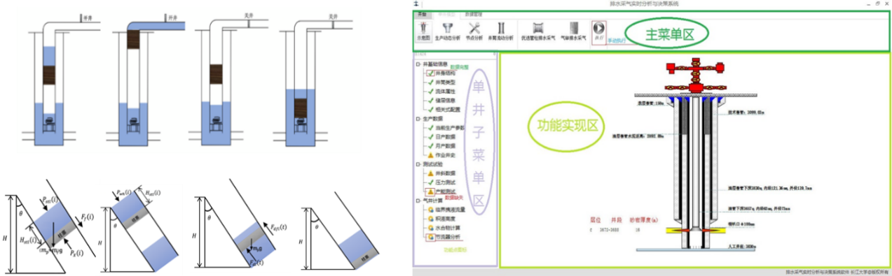基于多相流动力学原理与数字油田需求,研发了气举设计与远程诊断系统、气/液射流泵与柱塞气举排采优化技术,实现了举升系统运行状态的智能识别与动态调控。提出水平井与分支井完井参数优化、电潜泵参数智能设计及区块气井统一生产管理新方法,显著提升了采气效率与系统稳定性。同时,建立了多井优化集中控制及储层—井筒—地面一体化仿真技术体系,实现了生产全流程的智能协调与整体优化,为油气田的智能开发与管理提供了技术支撑。