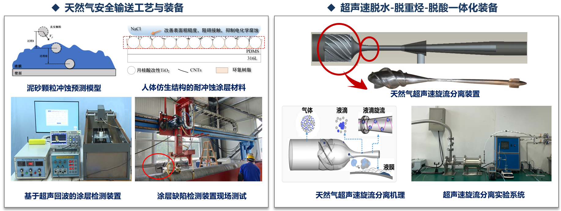 建立了多相耦合的泥砂颗粒冲蚀预测模型,构建了“超疏水防腐+耐磨表面+仿生缓冲结构”涂层新技术;针对传统检测手段易受外界干扰、定位不准确等技术瓶颈,研发基于超声回波特性的涂层检测装置。揭示了天然气超声速旋流分离机制,阐明了复杂组分天然气凝结交互机理,研发了超声速脱水-脱重烃-脱酸一体化装置,形成了紧凑高效天然气处理新技术。