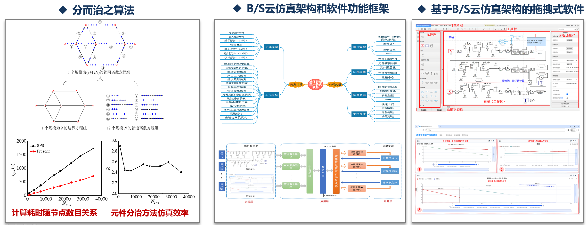 以输油管网流动、传热、组分和控制信号为一体的系统级多场耦合模型为基础,结合B/S云架构、图形组件拖拽式管网通用建模思想以及自研的自适应网格、移动网格、分而治之、CPU+GPU异构并行和智能优化等高效仿真和优化算法,形成了一款具备完整自主知识产权的国产化输油管道仿真与优化软件。开发了大型天然气管网物理层面元件解耦、大型稀疏方程组数学拆分的分而治之算法,开发了一款具备完整自主知识产权的B/S云架构国产化气体管道仿真软件,满足我国大型天然气管网瞬态仿真核心技术自主可控的重大战略需求。